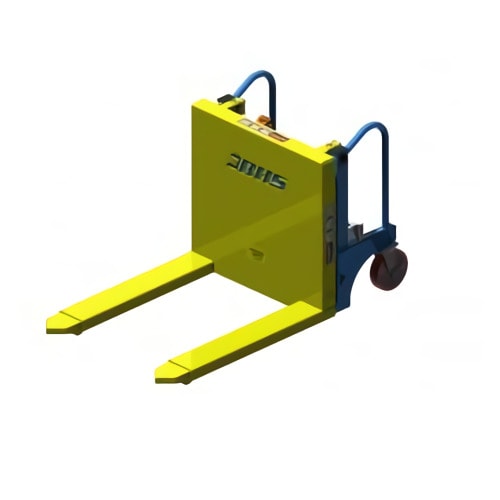 Es ideal para pasillos estrechos donde una carretilla elevadora no puede entrar. Cuenta con ruedas rígidas de bloqueo que evitan el movimiento de carga no deseado y ocupa un espacio mínimo.