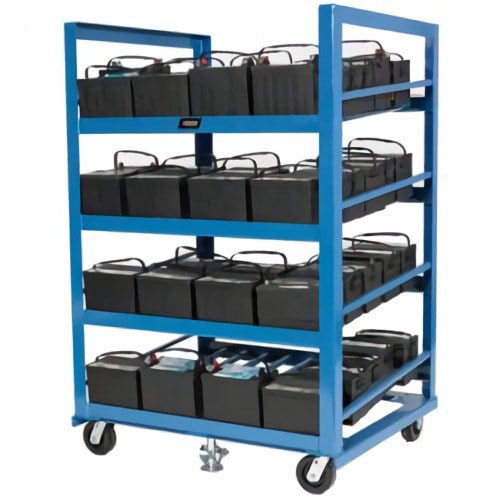 El soporte de batería de altura ajustable proporciona un lugar de almacenamiento seguro y duradero para las baterías de montacargas. BS-OF esta construido con acero de alta resistencia.
