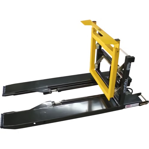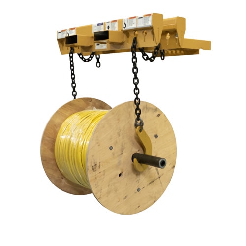 Se puede usar para levantar, transportar y cargar carretes en estanterías cuando no es posible levantar el carrete desde abajo. Levanta con seguridad carretes de hasta 5,000 libras desde arriba.