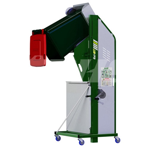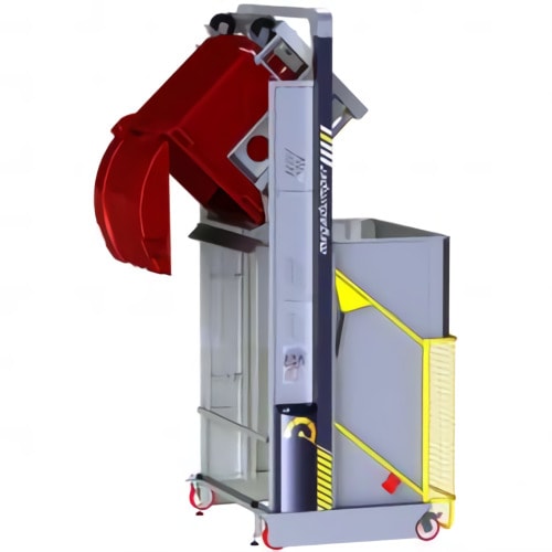 Este equipo proporciona una solución industrial de servicio pesado para vaciar contenedores grandes con pesos de hasta 1,323 libras (600 kilogramos). Es confiable, seguro y fácil de usar.
